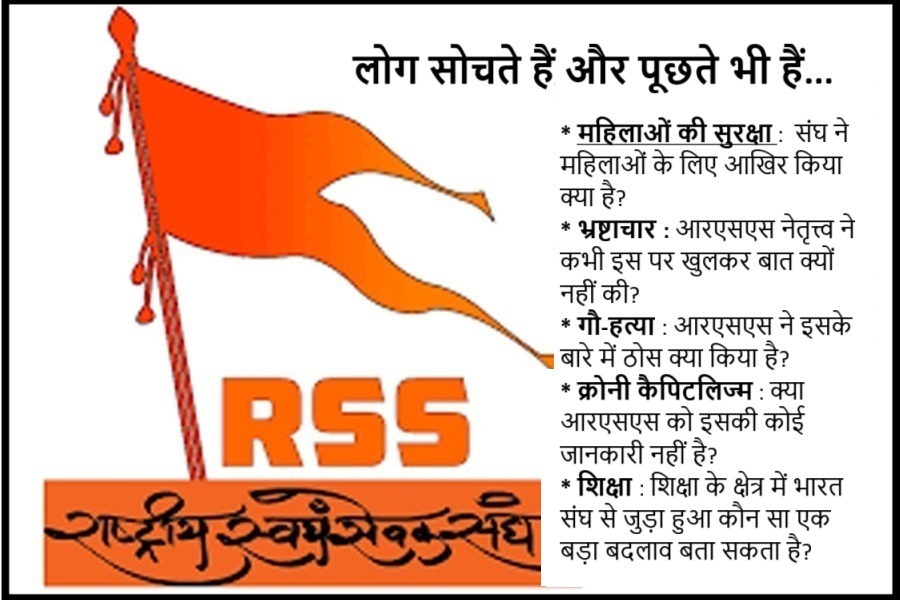 महिलाओं की सुरक्षा : लोग सोचते हैं और पूछते भी हैं कि संघ ने महिलाओं के लिए आखिर किया क्या है? राष्ट्रीय अपराध रिकॉर्ड ब्यूरो नियमित रूप से आँकड़े जारी करता है, जो लड़कियों और महिलाओं से बलात्कार तथा छेड़छाड़ में वृद्धि दिखाते हैं। मुझे याद नहीं कि संघ प्रमुख ने किसी भी भाजपाशासित राज्य के मुख्यमंत्री की कोई बैठक कभी बुलाई हो कि इन जघन्य अपराधों को प्रभावी ढंग से रोकने पर बात हो सके या इस पर गम्भीर चर्चा ही की हो। यह मेरी समझ से बाहर है कि संघ की महिला शाखा ‘राष्ट्र सेविका समिति’, जो 1936 में शुरू हुई, अपनी बहनों के साथ हो रहे लगातार अपराधों के खिलाफ विरोध रैलियाँ (जैसे पथ संचलन, आदि) क्यों नहीं निकालती?